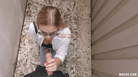 Выйдя с работы покурить на улице, девушка в очках еще не подозревала, что заработает так легко большое количество денег. Нет, ей и раньше предлагали парни деньги за секс, но впервые это произошло лично, когда запах легкой наживы кружится прямо перед носом. Первоначально героиня думала, что нужно показать только сиськи, но незнакомцу показалось мало, ведь если чикуля готова оголиться за доллары, то и дальше уговорить не составит труда. Пришлось уйти в ближайшую подворотню, будто специально оборудованную для шлюшек, готовых ради зеленых бумажек отдаться на грязном самодельном столе. Это стоило и обконченных очков и убегания от неожиданно заглянувшего в свое логово гражданина.