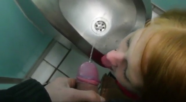 Лютая рыжая извращенка отправилась со своим бойфрендом в общественный сортир, который даже не имеет кабинок. Время позднее, сюда никто не зайдет. Она прямо в одежде села рядом с писсуаром и, когда ее приятель начал ссать в толчок, подставила язык для золотого дождя, отчего желтоватая жидкость перестала долетать до нужного места и пролилась на пол и рот девочки-сосочки. Следом она заглотила постепенно напрягшийся пенис, работая глоткой до максимума, отчего стала подкашливать и поперхнулась. Грязная хуесоска просто обожает подобные места, где, во-первых, есть страх спалиться, во-вторых, противно воняет и одно прикосновение к сортиру вызывает мурашки по коже с отвращением.