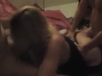 Хорошая компания включила музыку, приглушила свет, достала телефон с непонятным качеством съемки и пошла жара. Светленькая бабца установила свое тело в позе собачки, один товарищ пристроился сзади, второй добропорядочно уселся на диван, предоставив на отсос свой член. Классическая позиция для подобных дел. С каждой фрикцией голова дергается, хочется застонать, но не получается, да и мы не услышим, так как на фоне играет громкая музыка, не дающая соседям спать, если они вообще есть. Чуваку с телефоном не довелось присунуть на видео любвеобильной дамочке, он лишь ходит вокруг и думает как будет потом дрочить на этот материал в галерее мобилы.