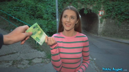 Охотник на доверчивых шкур вновь выбрался на выслеживание таковых. Буквально нескольких минут хватило чтобы найти подходящую жертву из числа красивых студенток. Одна как раз шла из колледжа домой, а на пути ей встретился этот раскидывающийся деньгами парень. За сотку евро он предложил снять куртку, еще за сто показать сиськи: такой у него эксперимент, проверять на что способны люди ради денег. Уже дошло до 500 евро за минет и, несмотря на наличие бойфренда, 25-летняя шлюшка согласилась. На этом этапе она узнала каких размеров достоинство и не стала просить доплату за проникновение длинным агрегатом.