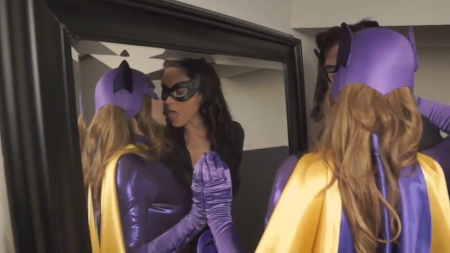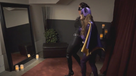 Бэтгерл как обычно прихорашивалась перед ночной сменой. В Готэме еще много разгуливающих по улицам преступников и большая часть из злодеев мужчины. Нельзя просто взять и выйти к ним неопрятной. Откуда-то послышался знакомый голос, но стало очень тяжело вспомнить кому он принадлежит. Он раскатисто звучит в голове, выявляя все изъяны похотливой девицы в костюме. Поддавшись на провокацию, самочка из комикса DC раскрыла грудь зеркалу, а потом резко очнулась и поймала Женщину-Кошку, прятавшуюся за занавеской. Еще предстоит выяснить как она попала в это логово, но сперва следует трахнуть пленницу тяни толкай и вибратором, извиваясь на полу.