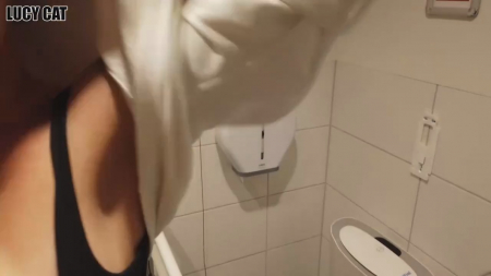 В каком-то здании, уж очень напоминающем немецкий аэропорт, блондинка вместе со вторым персонажем пошли искать туалет, в котором можно запереться. Перед этим девушка показала сиськи не оборачиваясь - там кто-то цокает каблуками в обратную сторону. Так как все сортиры в здании имеют только кабинки, пришлось заблокироваться в туалете для инвалидов - тут сенсорная кнопка, сам санузел очень чистый и обрабатывается раз в несколько часов. Милочка показала писечку под хорошей задницей и молодой человек вогнал в киску своего гуся, ему подружка еще не скоро надоест. После короткого перепиха, паренек закончил сверху на копчик и помыл кончивший хуй ротиком блондинки.