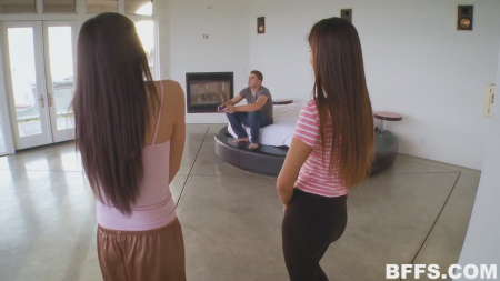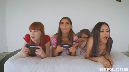 Девчонки пришли погостить к подруге, пока ее родители уехали в отпуск отдыхать. Дома есть только старший брат, но он сейчас рубится в приставку и ему не до девчонок, которые зачем-то рассматривают сиськи друг друга, хвастаются новым пирсингом и сравнивают размеры сосков. Вот им надоело и они пошли просить парня дать им три геймпада, которые даже не удосужились включить. Братик сделал вид будто ушел, а сам рассматривал задницы лежащих на кровати телочек, включая рыжую сестру. Он прошел по всем очередно, трахая сзади то одну, то другую, то третью. Девки делали вид будто ничего не происходит рядом, стараясь не коситься взглядом, пока вся троица не собралась ротиками вокруг члена.