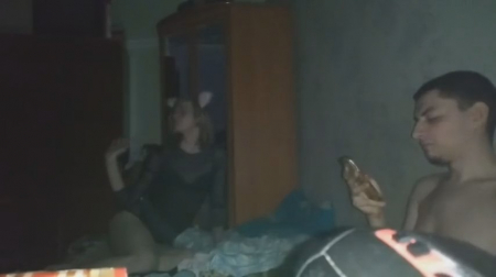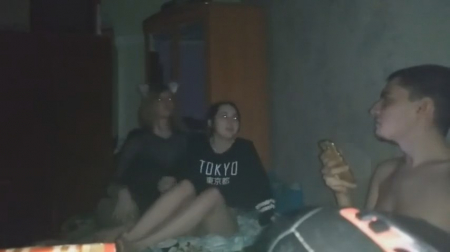 Негордый паренек остался с другом и двумя девушками после тусовки, все достаточно пьяные чтобы заняться свингерскими делами на съемной квартире ночью под включенную музыку. Темненькой больше всего хочется: ходит в одной футболке без трусиков, раздвигает перед телефоном ноги, подруга в очках ей дрочит писечку, а потом сразу вставляется пенис. Самое интересное, что это телка оператора и трахать его "любимую" собирается друг, а сам он лишь дал пососать, восхищаясь красотой классной девчонки - частой участницей домашних вписок. Ну для братика ведь не жалко, ага.