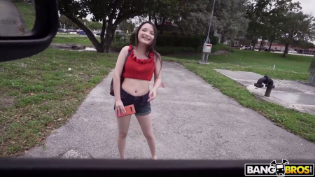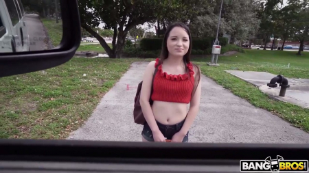 История проста: некие ребята на фургоне подцепили девку с нотками азиатской расы на лице, очень низкорослую, с брекетами на зубах. Для нее они сочинили историю, будто вся компания на ютубе занимается пранками, уговорив сесть в машину. Там за деньги, кинутые на пол, она светанула сиськами, а когда узнала, что сулит еще больше, согласилась переспать с пассажиром. Странно, но тот даже немного волнуется, хотя его член всегда в боевой готовности, увидеть маленькие сиськи хватило чтобы эрекция закрепилась. Дальше как в предыдущих подобных роликах: шлюшку попросили выйти сделать несколько фотографий напоследок, надавили на педаль газа, оставив в итоге ни с чем.