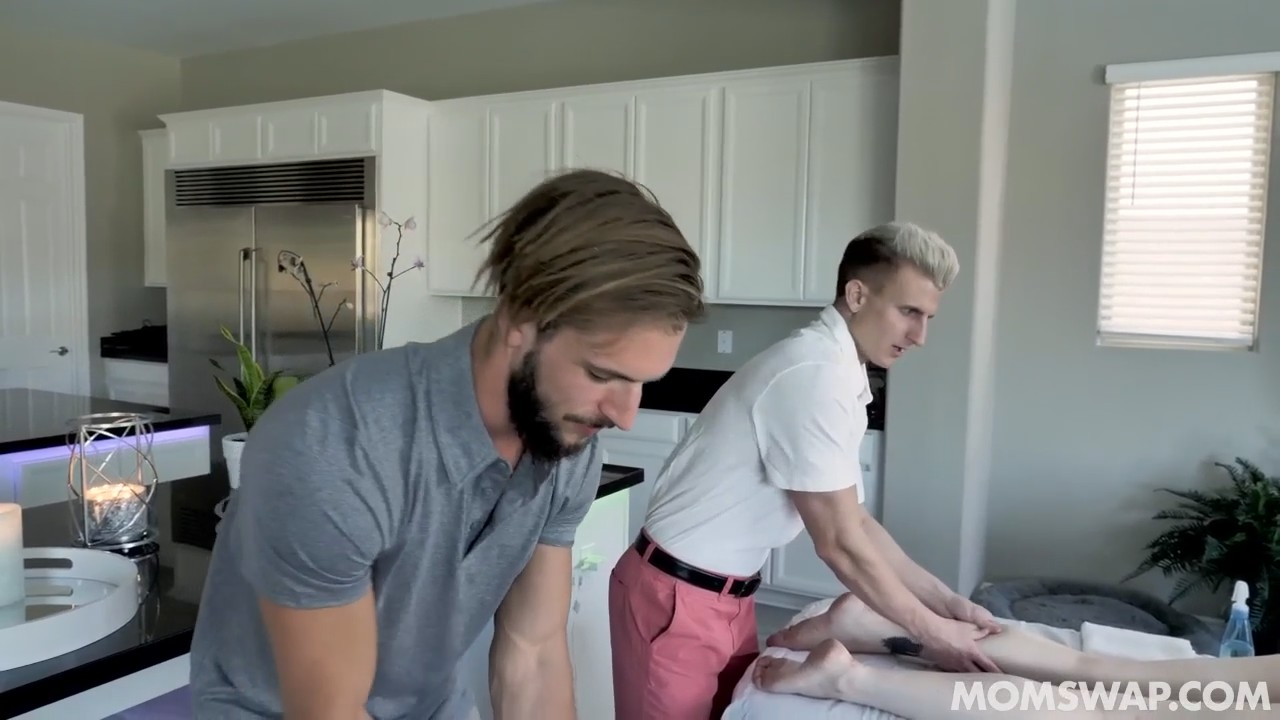 Женщины сидели на кухне и, как всегда, обсуждали половые вопросы. Это подслушали их отпрыски, выглядывающие со второго этажа и решившие развести женщин на потрахаться, сегодня как раз день матери, тут и подарок нарисовался сам собой. Парни распечатали поздравительные бумажки, попросив поскорее оголиться топлес и лечь на кушетки рядом друг с другом. Ребята поменялись мамками, ехидно поглядывая друг на друга. Неожиданно, милфы перевернулись на спину, показав четыре сиськи. Массаж стал более эротическим. Смекнув, что пора действовать, сынки приступили лямзать бритые и не очень дырочки мамаш друг друга, после чего одновременно дали им пососать, начав трахать стройных женщин совсем рядышком. Почти все прошло синхронно на 9 баллов.