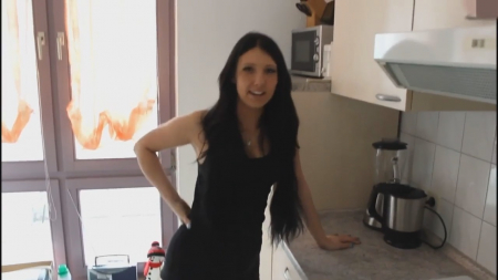 Брюнеточка встала первой и пошла искать чего сожрать в холодильнике. Следом за ней пришел ее сожитель. Поздоровавшись, он надеялся, что уже чего-нибудь приготовлено на завтрак, но нет - плита еще даже не включалась. Тогда девушка сняла с себя трусики и призагнулась, положив ножку на кухонную плитку - теперь он может утолить голод, но только сексуальный, за пару минут оттрахать любимую и ждать когда курьер привезет немецкой паре вредной еды. На середине секса симпатяга сняла с себя еще лифчик и футболку, выкинув в сторону, чтобы не замарать спермой, которую спустили в ротик.