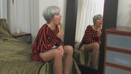 Юнец открыл ящик тети, увидев там самотык на тряпочке. Он сразу спрятался за диваном и стал выжидать когда женщина вернется и начнет им мастурбировать. Короткостриженная дама с пепельными волосами расположилась на кровати напротив зеркала, трахая киску игрушкой и глядя на саму себя. Она не заметила как за спиной появился дрочащий мальчик, решивший покашлять чтобы привлечь внимание недотраханной родственницы. Помощь ей сейчас не помешает, недостаток мужского внимания полностью компенсировался молодым членом в проколотую пирсингом пизду. Еще и пошутил над загаженной простынью перед уходом для поднятия настроения тетки.