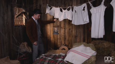 Симпатичная милашка пробралась тайком в чужой сарай, но ее застукал хозяин помещения. Мужчина выбрал довольно странное наказание для прелестной незнакомки - он поставил девку раком и стал ласкать ее попку. После непродолжительных ласк богато одетый мужчина вонзил твердый член в анал крестьянке.