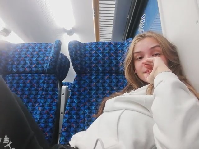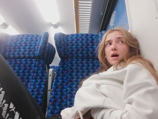 Молоденькая любительница получать легкое удовольствие заприметила, что вагон совсем пустой. Ее это сразу навело на мысль о мастурбации, к которой она приступила, просунув руку под штаны. Ее выражение лица говорит о том как ей хорошо, но приходится смотреть по сторонам, чтобы никто из пассажиров электрички ничего не заподозрил. Второй рукой она трогала грудь - так намного приятней - весь кайф волнами разносится по телу нимфоманки.
