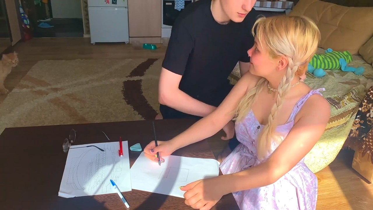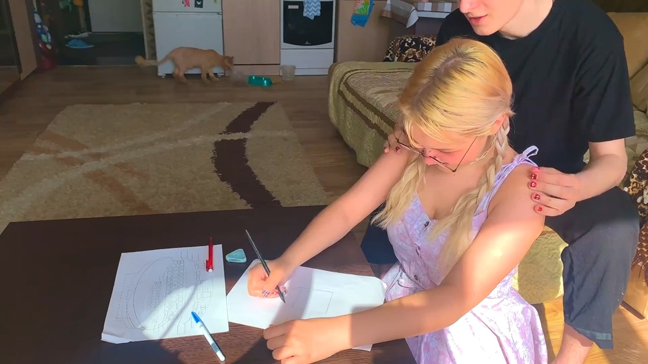 Смешливая девчонка в очках собралась поступать на художественный факультет, но даже с обычными кубами у нее большие проблемы, причем сама героиня не видит проблем, но видит друг, который принес стирательную резинку и показал огрехи. Также интересна его философская мысль: поступает не тот, кто подготовился, а тот, кто уверен в себе. Приятель считает, что именно уверенности не хватает подружке, которой стало еще более страшно от его прикосновений к плечам и поцелуя. Далее все как по накатанной: взаимный обмен оральными ласками и секс до окончания спермой на язычок, а оттуда на девичью грудь.
