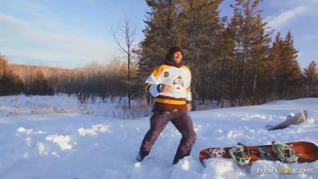 Когда ты так сильно любишь потрахаться, уж точно найдутся парни, готовые заплатить за твою поездку куда-нибудь вместе отдохнуть. Двое отличных друзей везут потаскушку почудачить на сноубордах и уже по пути в машине она отсосала и дала себя отыметь на заднем сидении. Совсем немного покатавшись на фуникулере с хуем во рту, по склону с голыми сиськами, телочку начинают пороть раком, но Энджэл толкает ребят в снег и сама убегает в дом, где с ней продолжаются приключения в душе и на обычном диване. Двойное проникновение - это то, что реально приносит удовольствие телочке больше развлечений на холодной улице.