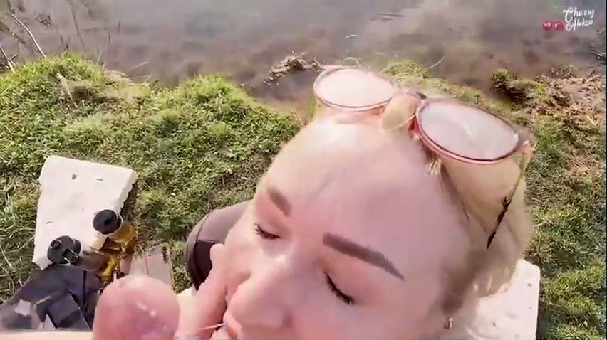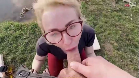 Под открытым небом возле водоема присели отдохнуть россияне, достав с собой две спортивных бутылки, наполненных пенным напитком. Осушив больше половины, было решено записать новое видео - такая работа у этих двоих. Светловолосая милфа в очках согласилась и первый же кадр сделала вполне себе удачным - она заглотила так, что глаза на лоб полезли, куда она потом убрала свои очки, чтобы не мешали, но многим нравится смотреть именно на очкастых сосалок, так что она их возвращает обратно и пачкает об залупу, которой ей поводили по окулярам просто ради прикола.