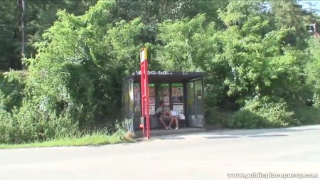 Первой на автобусной остановке оказалась девица, севшая на лавочку ждать свой транспорт. Следом за ней появился мужчина, который сел рядом. Его руку незнакомка взяла в свою и прикоснулась его пальцами к своей киске - она была без трусиков и очень влажная. Сразу после этого телочка с короткой челкой отсосала публично, несмотря на проезжающие по шоссе автомобили и дала себя выебать стоя, после чего парочка отправилась неподалеку за забор, чтобы продолжить свою интимную близость на природе с фоном в виде домов, но все так же не менее публично.