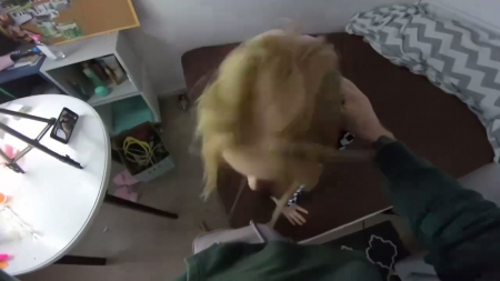 Девчонка-зумерка в трусиках и кофте позирует перед камерой в руках бойфренда и поглядывает в сторону другого телефона, на котором дублируется запись со включенным экраном. Девочку принуждают начать сосать и она с радостью повинуется, после чего ложится на спину, чтобы татуированный бойфренд потрахал ее киску по-миссионерски, глядя на разведенные ноги и пухленький животик вместе с сиськами. После этого героиня любительского ролика становится на колени для секса рачком, чтобы парень еще больше шлепал ей по ягодицам докрасна и тянул на себя за кофту, зажав ее в кулаке, напоследок кончив рядом с носом.