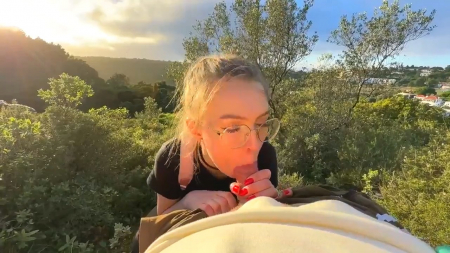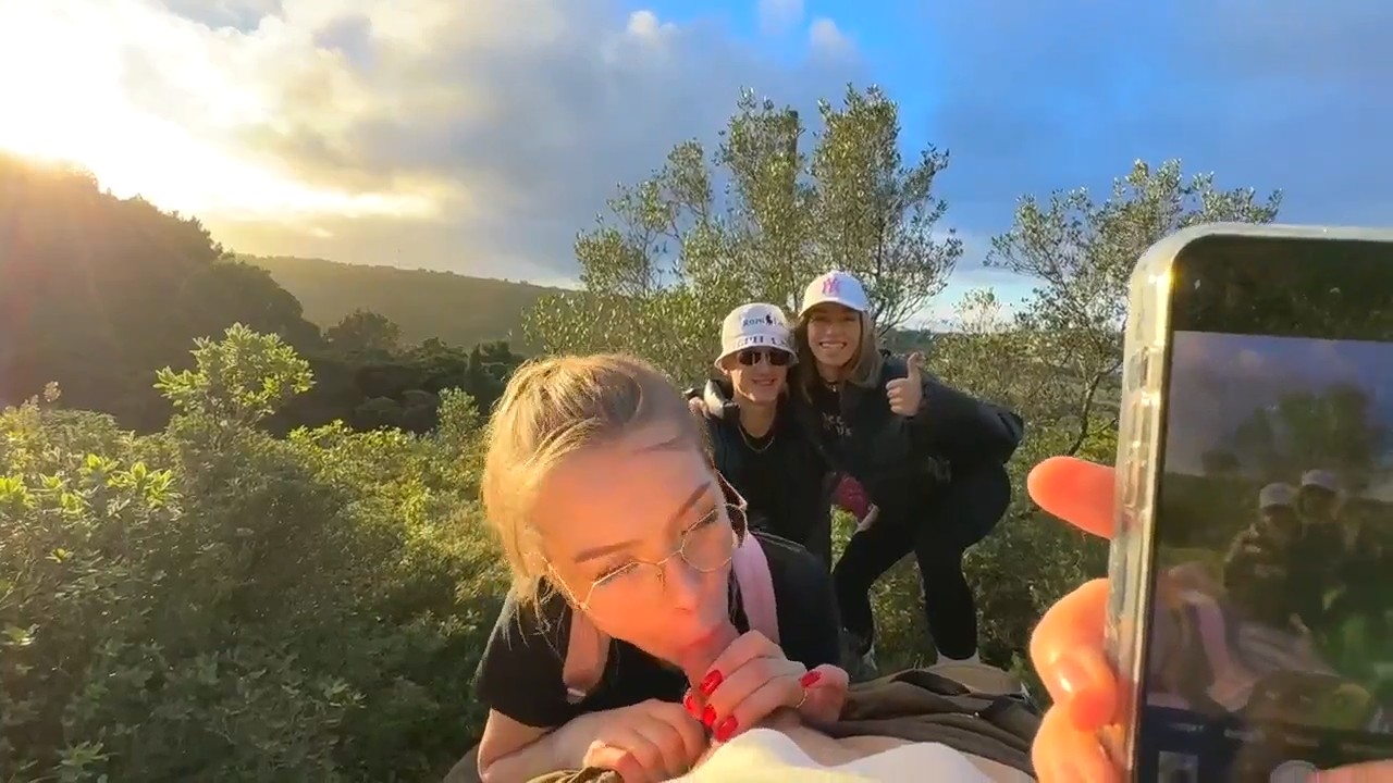 Красивая русская девчонка посреди зеленого холма делала минет своему молодому человеку. Глаза наслаждались ее личиком, его член наслаждался ротиком, все было прекрасно. Но тут за спиной подруги появились два силуэта, не особо смутившихся от увиденного и еще менее засмущалась сама делающая минет милашка, не переставшая сосать и не обернувшаяся на незнакомцев, спросивших можно ли подняться по холму еще выше, а второй просьбой стала фотография на мобильник. Им даже интересно стало, получилось ли запечатлеть сосущую и их на фоне одновременно. После этого незнакомцы ушли, а девочке кончили в рот, чтобы та выплюнула семя на землю.