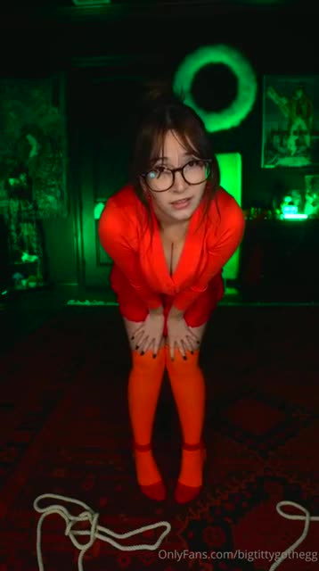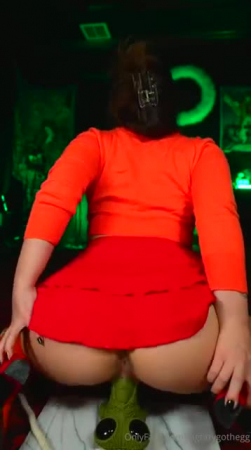 Все друзья куда-то потерялись и Велма осталась одна. Она нашла тихое помещение с инопланетным монстром, с которым завела беседу. Он ничего не отвечал, но и не нападал, зато его большой зеленый пенис торчал и привлекал слишком много внимания девчонки в очках. Велма из Скуби-Ду решила воспользоваться ситуацией и немного поприседать на странный фаллоимитатор сверху, приподняв юбочку так, чтобы было видно ее сексуальную попку. Ведь не обязательно же рассказывать остальным чем она тут занималась несколько минут, верно же?!