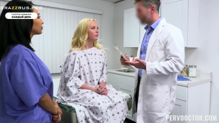 Красивая медсестричка с темными волосами осмотрела пациентку внешне, измерила ее рост и вес. Эти показатели не выявили никаких отклонений, а так как помощница доктора работает в клинике свой первый день, она позвала настоящего врача и ему вновь поведали историю о том, что присутствует некая сухость там внизу пациентки. Доктор заимел отличную возможность продемонстрировать как на вкус и ощупь исследовать женскую грудь, после чего сел на стул и начал гонять лысого, попросив медсестричку помастурбировать блондиночке. Уже тут он предложил инкапсулировать свой предэякулят - это действенный метод, который срабатывает в ста процентах случаев сухости между ног.