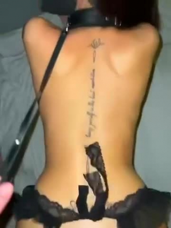 Поводив инструментом наказания между половых губок стоящей на коленях стройняшке в кружевных черных чулках, бойфренд шлепает штуковиной по красивым ягодицам, отчего девушка вздрагивает и постанывает - еще от первых прикосновений ее киска была достаточно возбуждена для начала полового сношения перед камерой мобильного устройства. Через минуту бойфренд стал готов наказывать и собственным органом раком аппетитно стонущую дрянь с татуировкой на позвоночнике. Шлюха в ошейнике повиновалась когда ей приказали посмотреть на хозяина, за это она получила плевок в лицо, а сразу после парень поставил ей на голову ногу.