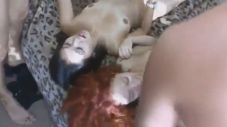 Групповое порно с двумя очаровательными подружками и их мужчинами. Весь половой акт мы не увидим, лишь концовку столь увлекательного ролика. Парни одновременно кончили подружкам - рыжей и брюнетке - в их нежные ротики (каждый своей, разумеется).