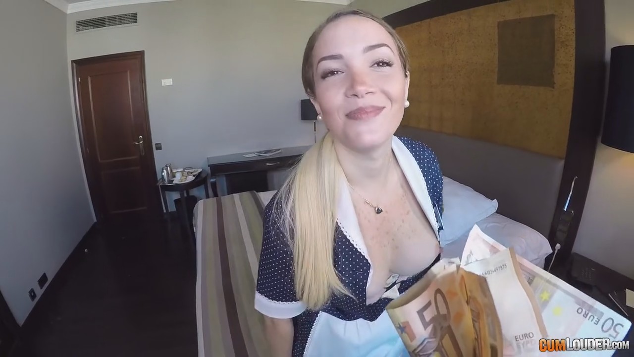 Симпатичная девушка принесла еду в номер для постояльца. Но так получилось, что еда мужчину заинтересовала меньше всего, а вот девушка вызвала неподдельный интерес. За некоторое вознаграждение мужчина предложил работнице отеля показать сиськи. Сделав вид, что она сопротивляется, шлюшка уже давно все для себя решила - за энную сумму показала мужику аппетитную грудь, потом и сочную попку, ну а дальше остановиться было все сложнее и сложнее - ведь сумма, как и просьбы, росла. Жаркое соитие незнакомцев закончилось спермой на личике продажной шкуры.