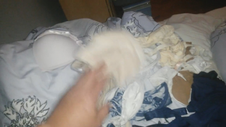 Идеальная жена, на которую можно вздрочнуть - спящая. Видимо, именно так подумал мужчина, потому что едва заметив, что любимая уснула, он обнажил большую грудь дамочки и принялся за дело. С чувством, толком, расстановкой дрочер продумал все детали. Поскольку мужчину безумно возбуждают лифчики, то он собрал все предметы женского белья, которые имелись у жены в наличии, и обложил неподвижно лежащую подругу, даже несколько на себя одел, и продолжил теребить шкурку.