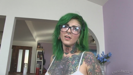 Чаще всего именно неформалки самые жгуие в постели. Они не боятся экспериментировать в сексе и с внешностью. Куча татуировок, пирсинг во всех возможных местах, огромные туннели в ушах, сплит языка и ядовито-зеленые волосы - неформальнее этой девчонки придумать сложно. А теперь представьте, как она будет облизывать головку вашего члена своим раздвоенным языком - возбуждает? То-то же. Поэтому оператор знал, с кем ебаться на камеру, и уж трахается эта сучка похлеще всяких ваших порно актрис - выкладывается на полную, чтобы доставить максимальное удовольствие себе и партнеру. И по ней видно, что она живет в кайф.