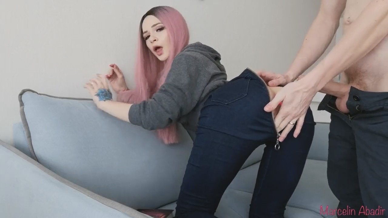 Все видели новый тренд в шитье женских джинс? Это когда молния находится не спереди, как обычно, а сзади, при этом длиной со всю задницу. Многие мужчины, когда видели девчонку на улице в таких штанах, задумывались - вот было бы удобно трахать эту даму, просто расстегнув ширинку. Так вот - теперь вы можете, как минимум, на это посмотреть. Розововолосая неформалочка с татухами специально надела такие джинсы, чтобы ее бойфренд расстегнул их, немного приспустив, и затем трахнул сучку на диване, не снимая джинс. Как же это удобно, черт возьми - и не передать.